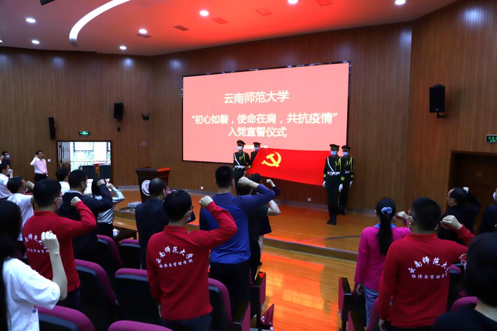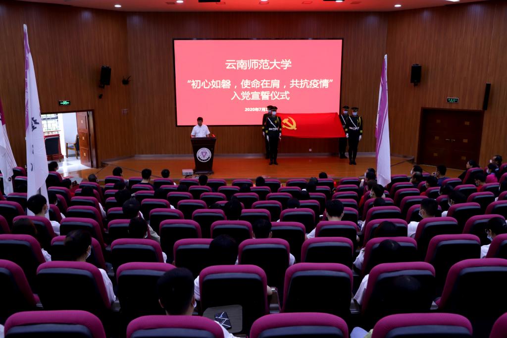 7月1日下午,我校在呈贡主校区汇学2栋101报告厅举行了“初心如磐,使命在肩,共抗疫情”入党宣誓仪式。校党委书记饶卫同志、校党委副书记张玮同志,党委办公室、党委组织部、党委宣传部、党委统战部、机关党委、校团委、研究生工作部、学生工作部等部门主要负责人。呈贡主校区各学院党委(党总支)负责人、带队教师和2020年新入党的师生党员代表共200余人参加仪式。入党宣誓仪式由校党委副书记张玮同志主持。