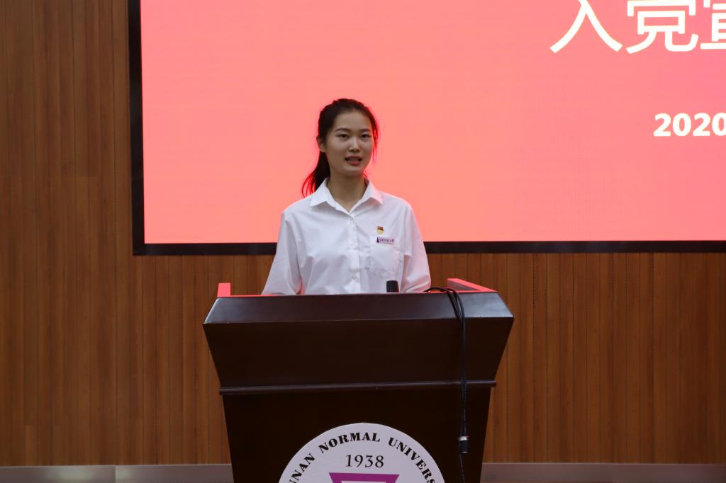 随后,教育学部学前教育专业18A班的刘漫媛同学作为新党员代表发言。她回忆了假期加入社区疫情防控队伍,参与疫情防控工作的经历,表示要努力在为人民服务中茁壮成长、在艰苦奋斗中砥砺意志品质、在实践中增长工作本领,用实际行动去证明新时代中国青年是堪当大任的,让青春在党和人民最需要的地方绽放绚丽之花。