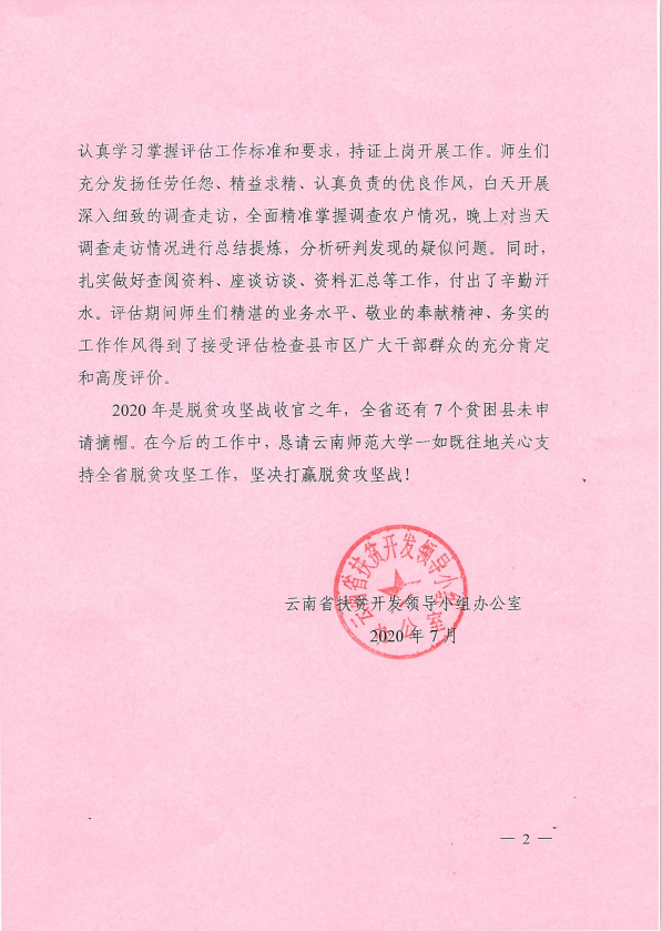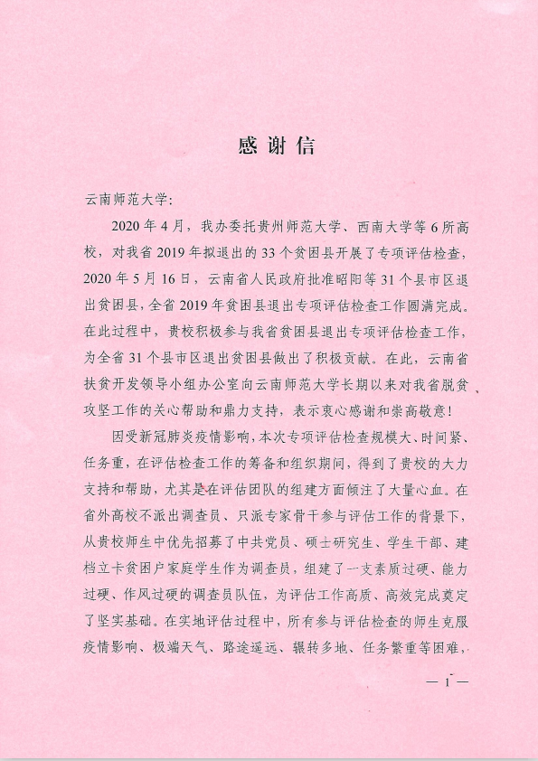 2020年上半年,我校组建了一支素质过硬、能力过硬、作风过硬的贫困县退出专项评估检查队伍,高质、高效地完成了云南省扶贫开发领导小组安排的2019年贫困县退出专项评估检查工作。近日,云南省扶贫开发领导小组办公室向学校发来感谢信,对学校积极参与我省贫困退出专项检查工作给予充分肯定。