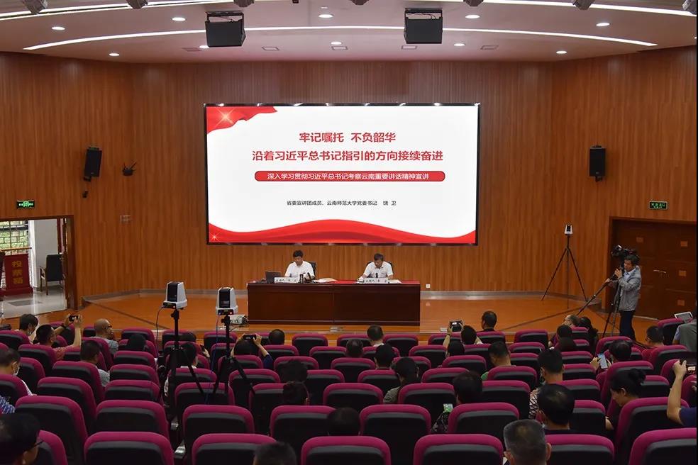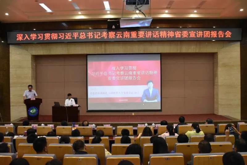 7月8日,我校在呈贡校区汇学二号楼报告厅召开深入学习贯彻习近平总书记考察云南重要讲话精神宣讲报告会暨校(院)两级党委理论学习中心组(扩大)学习会,学习会由校党委副书记李宏主持,省委讲师团调研员马兴坚到会指导。校党委委员、校领导以及全校在职处级干部、思政课教师共300余人参加了宣讲会。学习会还同时在我校一二一西南联大校区和马克思主义学院设了2个视频分会场。
