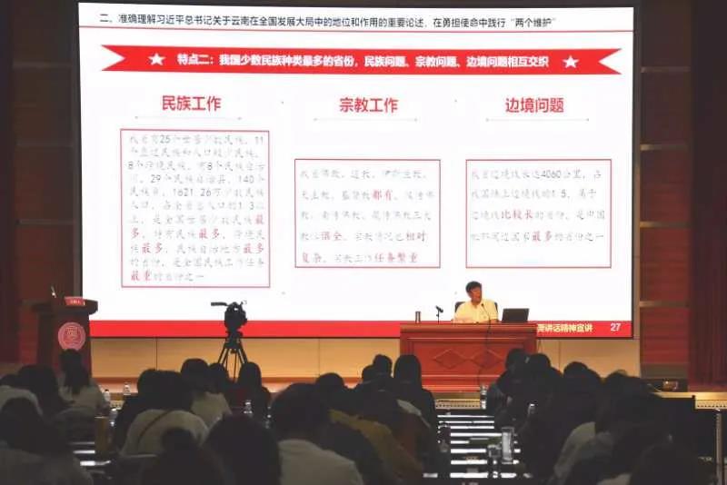 饶卫书记以《牢记嘱托 不负韶华 沿着习近平总书记指引的方向接续奋进》为题,围绕以下五个方面进行宣讲:一是准确把握习近平总书记考察云南重要讲话精神的重大理论意义和现实意义,坚定不移沿着总书记指引的方向奋勇前进。二是准确理解习近平总书记关于云南在全国发展大局中的“四个特点”的重要论述,在勇担使命中践行“两个维护”。三是准确把握习近平总书记对云南作出的“四个方面重要指示”的深刻内涵,把总书记为云南谋划的宏伟蓝图变为美好现实。四是深刻领会习近平总书记考察西南联大旧址重要指示精神,大力培养有历史感、责任感、志存高远的时代新人。五是抢抓重大机遇,推动习近平总书记考察云南重要讲话精神在365英国上市官网落地生根、开花结果。饶卫书记的宣讲报告主题鲜明、逻辑严密,深入浅出接地气,系统阐释了习近平总书记考察云南重要讲话精神的重大意义和丰富内涵,为我们进一步全面理解习近平总书记考察云南重要讲话精神,深刻领会其中蕴含的世界观、价值观和认识论、方法论,准确把握云南各项事业在全国发展大局中的坐标方位、前进方向,确保各项事业始终沿着正确方向前进提供了思想支撑,也为我们进一步从中华民族伟大复兴的战略高度弘扬西南联大爱国精神,培养社会主义建设者和接班人提出了努力方向。
