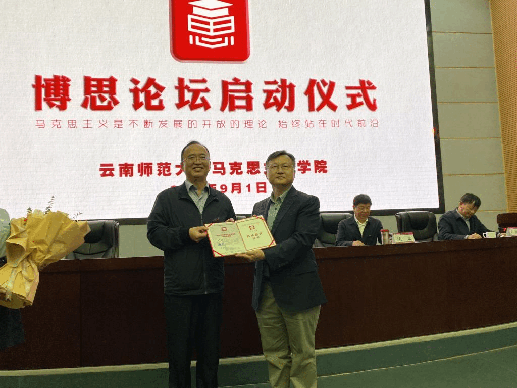 启动仪式上,校党委书记饶卫、校长蒋永文、中国人民大学郝立新教授、云南民族大学张建国教授共同为“博思论坛”揭牌。蒋永文校长为郝立新教授颁发了首讲嘉宾证书。