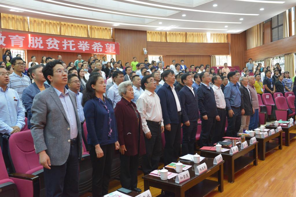 大会在激昂雄壮的国歌声中拉开序幕。蒋永文校长在致辞中代表学校向辛勤耕耘、默默奉献在各个工作岗位上的全体教职员工致以节日的问候和崇高的敬意,向为学校改革发展作出贡献的离退休老同志致以亲切的慰问。蒋校长指出,学校认真贯彻落实习近平总书记关于教育工作和教师队伍建设的重要论述,坚持把加强教师队伍建设作为事业发展最重要的基础工程来抓,实施人才强校战略,深入推进人事薪酬制度改革、不断加大人才引培力度。近年来,学校扎实推进教育精准扶贫,创新“输入管理+培养师资+共享资源”模式,充分发挥优质基础教育资源辐射带动作用,各教育扶贫地区的教师综合素质、学校教学质量、区域教育水平得到全面提升。下一步,学校将继续坚持把教师队伍建设摆在优先的战略位置,不断加强师德师风建设,弘扬尊师重教优良传统,切实为教师解难事、办实事、做好事,不断增强教师的获得感、幸福感。蒋校长希望广大教师按照“三个牢固树立”“四有好老师”“四个引路人”“四个相统一”的要求,自觉加强师德修养,不断提高业务能力,做到政治强、情怀深、思维新、视野广、自律严、人格正,用高尚的人格魅力赢得学生敬仰,用模范的言行举止为学生树立榜样,做塑造学生品格、品行、品位的“大先生”,做新时代党和人民满意的好老师。