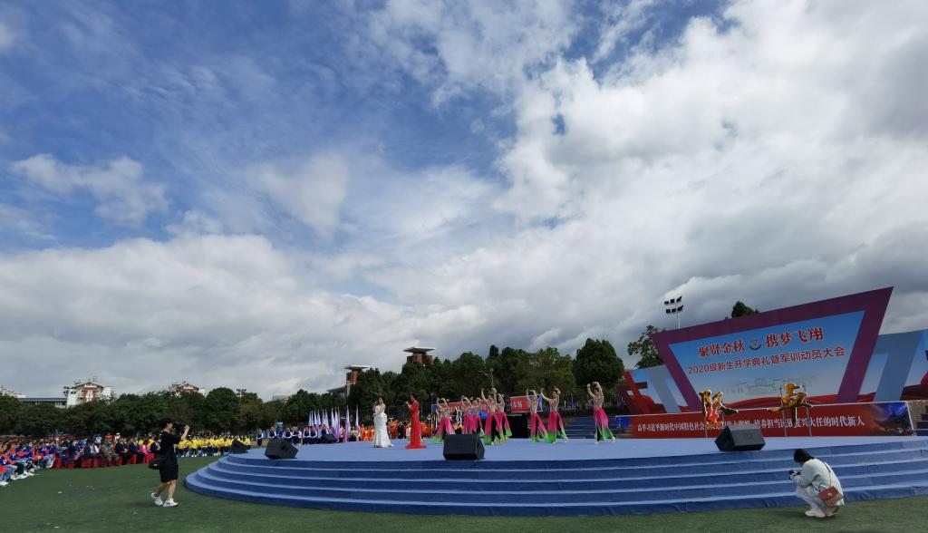 在精彩的锣鼓与舞龙舞狮表演中,开学典礼拉开了序幕。随后,学校校旗、各学院院旗先后入场,旗手们精神抖擞,展示了云师学子蓬勃向上的青春风采。