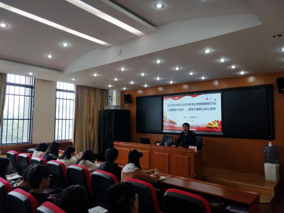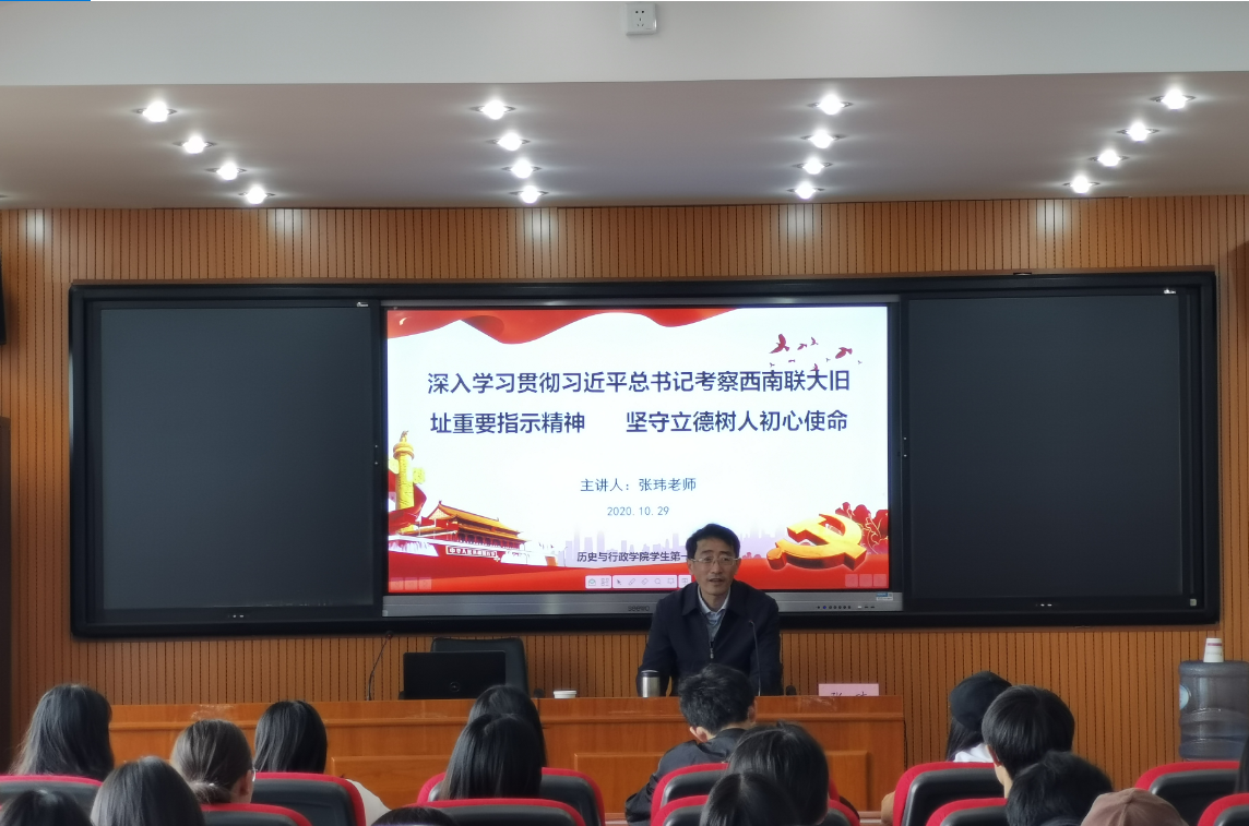 10月29日下午,校党委副书记张玮同志在明德3号楼以“深入学习贯彻习近平总书记考察西南联大旧址重要指示精神 坚守立德树人初心使命”为主题为历史与行政学院学生第一党支部上党课。历史与行政学院党委委员、党委副书记徐振坤,学生第一党支部50余名党员、发展对象、入党积极分子聆听了党课。