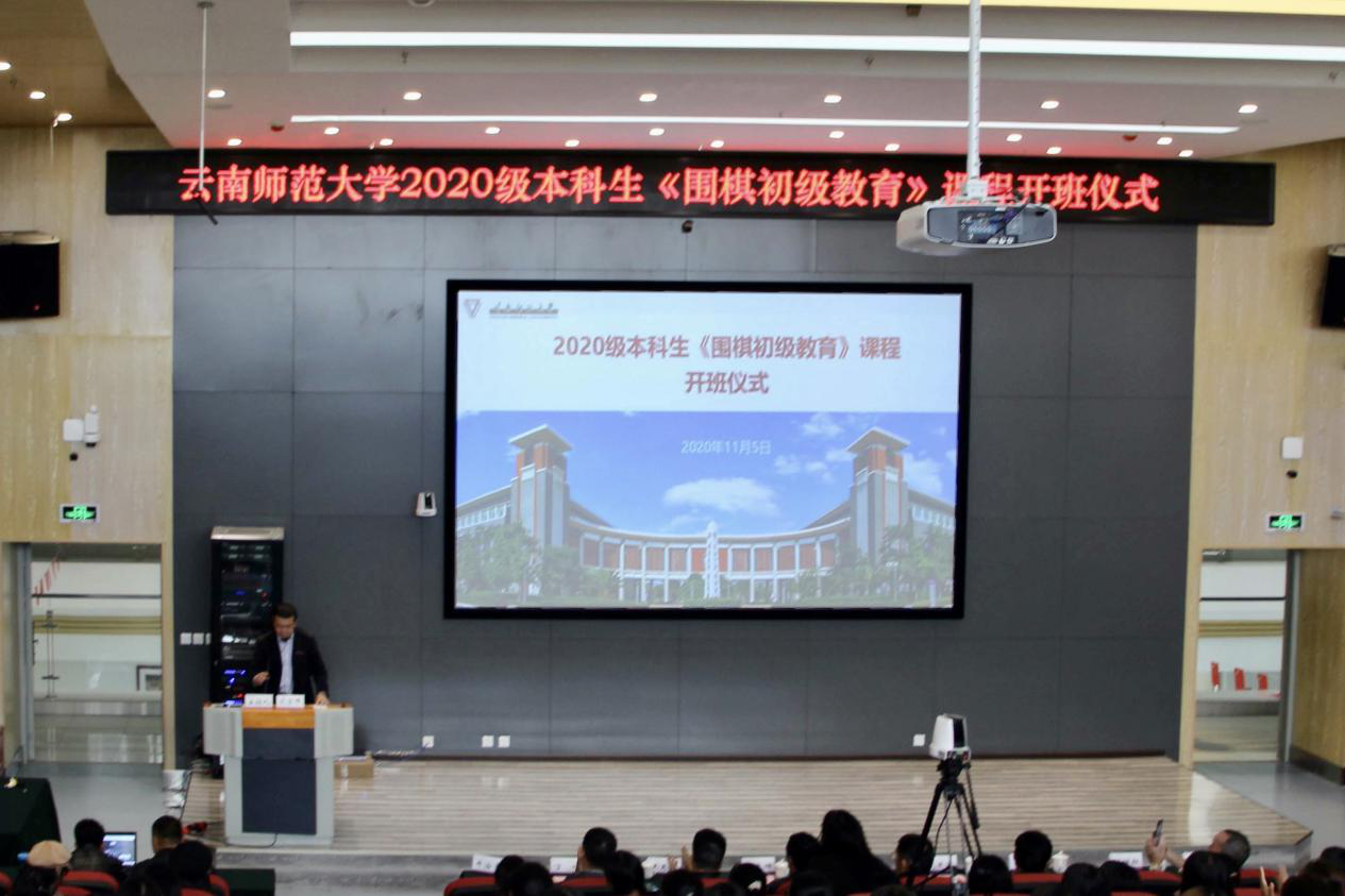 11月5日下午,365英国上市官网2020级本科生《围棋初级教育》课程开班仪式在呈贡校区国家教师教育教学实验示范中心举行。全国政协第十届、十一届常委、云南省政协原副主席曾华,省教育厅体卫艺处处长徐忠祥,云南省围棋协会主席陆军,云南省围棋协会副主席、省学生体育协会围棋专业委员会主任王东旭,云南省围棋队总教练邱继红,云南籍唯一九段棋手丁伟,365英国上市官网副校长牛治亮、武友德,相关职能部门领导,《围棋初级教育》课程授课老师及学生代表参加开班仪式,开班仪式由牛治亮副校长主持。