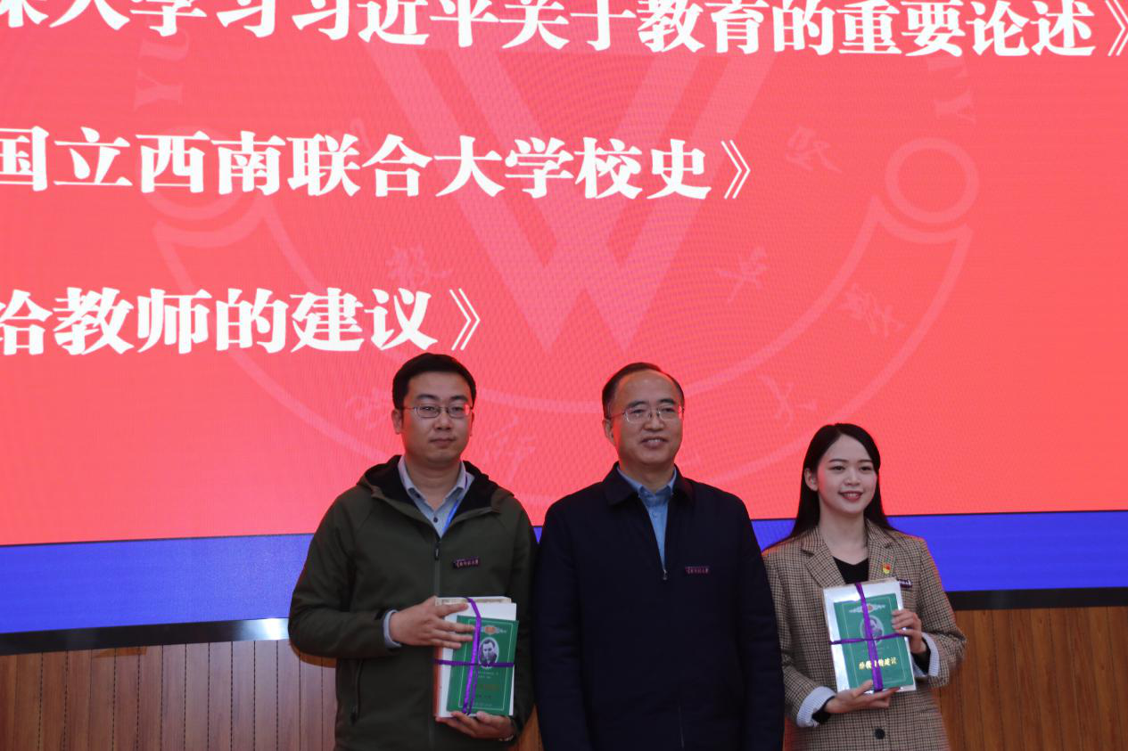 校长蒋永文教授代表学校向新入职教师代表赠送了《深入学习习近平关于教育的重要论述》《国立西南联大大学校史》《给教师的建议》三本书籍,表达了学校对所有新进教师的祝愿与期望。