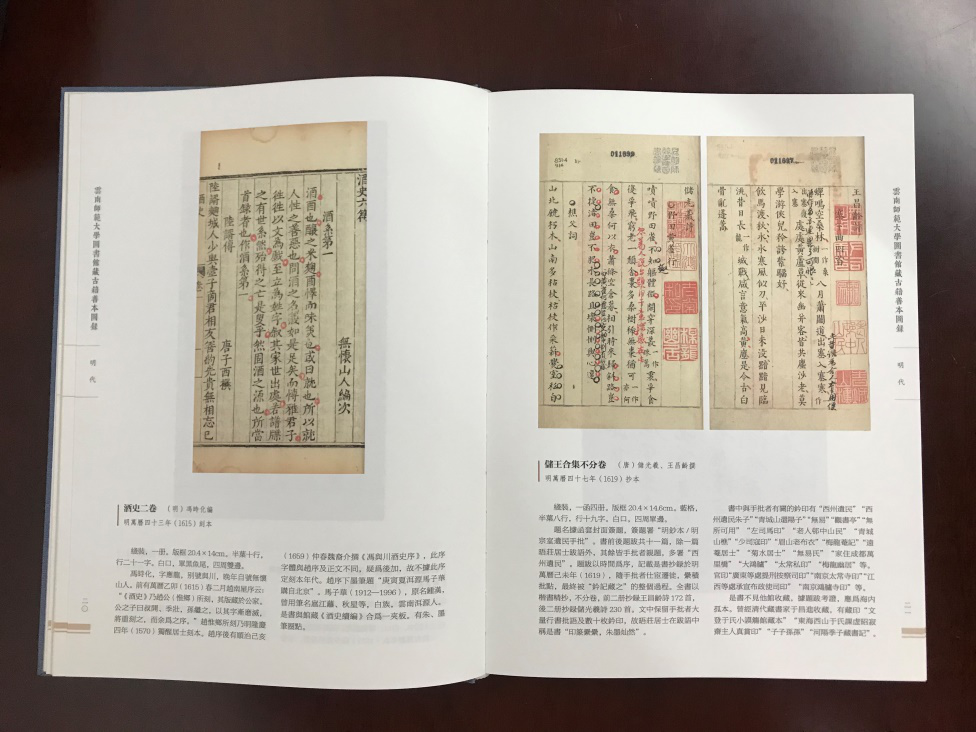 图录的形式能直观、精准地揭示古籍版本的特征,便于古籍版本研究者对比甄别,也让原本深锁于函柜的珍贵古籍直观地呈现在读者面前。图书馆按国家文化部发布的《古籍定级标准》,甄选出定级在三级乙等及以上的馆藏古籍列为善本,共121种编入《图录》,其中有入选第六批《国家珍贵古籍名录》的明嘉靖杨鑨九洲书屋刻本《初学记》,有明万历抄本《储王合集》、清乾隆武英殿木活字本《归潜志》《诗总闻》、王鸣盛批点清康熙刻本《海叟诗集》,还有联大时期所藏的清康熙刻本《云南府志》等,均可体现出馆藏善本的特色及价值。