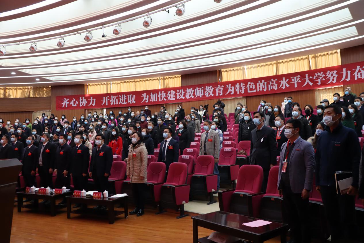 大会在庄严雄壮的国歌声中开幕。校党委副书记、校长蒋永文向大会作了《坚定信念 奋力攻坚 深化教师教育为特色高水平大学建设》的工作报告,从九个方面回顾了2020年的学校发展情况:一是砥砺前行、善作善为,党的建设全面加强;二是攻坚克难、责任担当,疫情防控成效明显;三是真抓实干、改革创新,人才培养质量稳步提升;四是瞄准靶心、盘清理活,科研道路更加坚实;五是对标看齐、全力以赴,学科建设更有质量;六是制度为纲、抓稳争优,师资队伍建设更加扎实;七是开放共享、求真务实,对外合作水平更出实效;八是聚焦教育、一线攻坚,社会服务工作更增厚度;九是依法治校、情系民生,综合保障工作更添深度。在分析存在的短板与不足的基础上,蒋永文校长对学校2021年重点工作提出了要求:一是要抓习近平总书记考察西南联大旧址重要指示精神的贯彻落实,扎实推进特色化、内涵式、高质量发展;二是要抓全面从严治党,用一流党建为“双一流”建设保驾护航;三是要抓疫情防控常态长效,全力确保校园安全稳定;四是要抓顶层设计,强化制度建设,推进治理体系和治理能力现代化;五是要抓教育质量和内涵,巩固立德树人的根本;六是要抓学科发展新格局构建,提升学科核心竞争力;七是要抓科研创新,有效推动科研成果转化;八是要抓一流师资队伍建设,提升教师专业化水平;九是要抓深化开放办学,形成教育国际化新局面;十是要抓社会服务,提升教育贡献能力;十一是要抓民生改善,提升师生幸福指数。