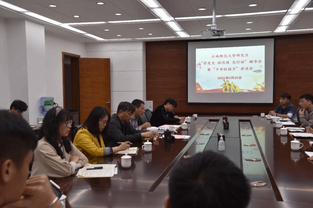 3月25日下午,校党委李宏副书记在呈贡校区211会议室主持召开研究生“学党史 悟思想 见行动”辅导会暨“平安校园月”座谈会,宣传部、校团委、研究生处,各培养单位研究生及研究生会代表参加座谈。
