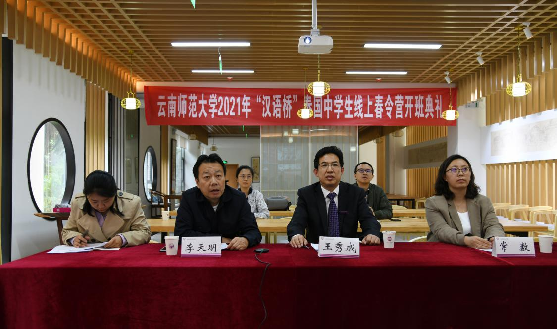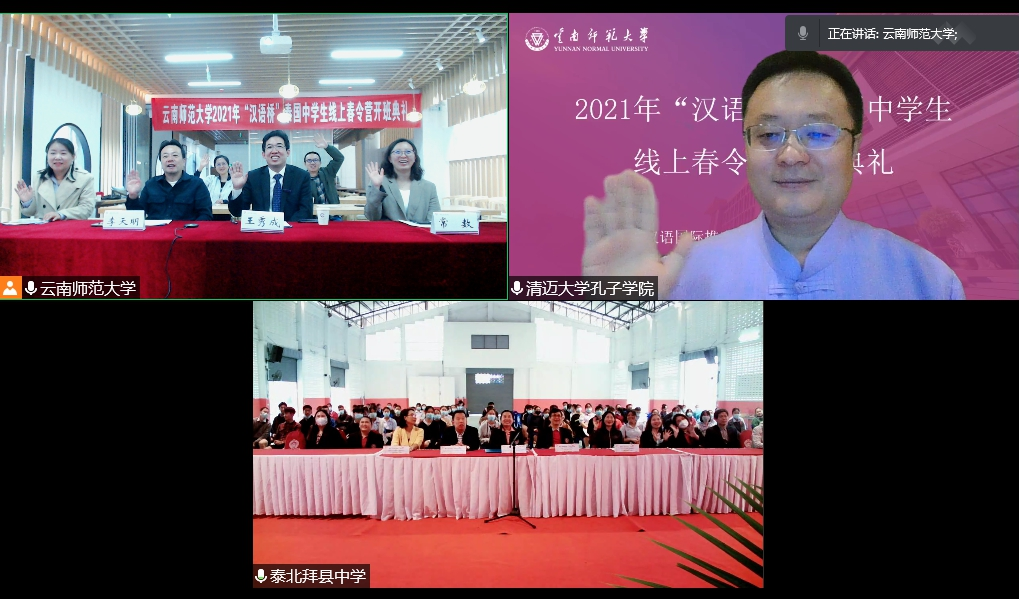 为进一步做好中文国际推广与中外人文交流工作,延续“汉语桥”项目热度,我校国际汉语教育学院承办了国家中外语言交流合作中心2021“汉语桥”泰国中学生线上春令营项目。4月4日上午,春令营开班典礼以“云连线、云直播”的方式,在我校呈贡主校区同析2号楼茶艺教室、泰国清迈地区拜县中学大礼堂和清迈大学孔子学院会议室三地同时举办。国际汉语教育学院院长王秀成、党委副书记常数、副院长李天明,泰国清迈地区拜县中学副校长金达女士,清迈大学孔子学院中方院长沈毅等领导出席,365英国上市官网汉语国际推广师资培训基地(昆明)全体工作人员、拜县中学教师代表以及122名春令营营员学生参加,开班典礼由李天明副院长主持。