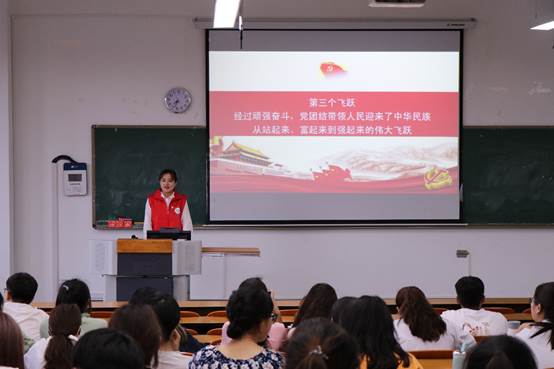 第二阶段,宣讲团成员杨雅淇、张欣雅、杜鹏飞同学以“共产党团结带领人民迎来中华民族从站起来、富起来到强起来的伟大飞跃”为主线,依托革命故事与精神,优秀共产党员榜样等分别对三个伟大飞跃进行讲解,强调我们要坚定“四个自信”,缅怀先烈,忆苦思甜,不负时代,牢记当代青年的使命。活动尾声,化学化工学院团委副书记段泽军同学代表参会学生做总结发言,宣讲会圆满结束。