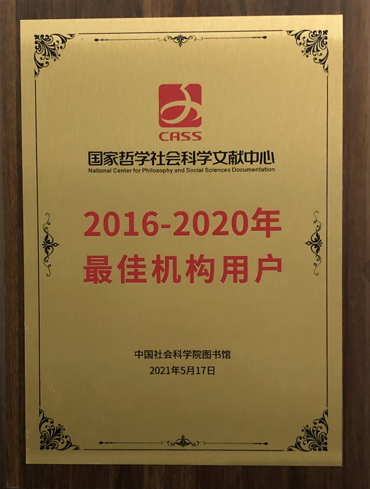 2021年5月17日,正值习近平总书记在国家哲学社会科学工作座谈会上发表重要讲话五周年之际,中国社会科学院举办了“国家哲学社会科学文献中心建设成果发布会”。会议评选出了2016—2020年最佳机构用户、最受欢迎期刊。我校图书馆因对“文献中心”资源宣传推广效果好、文献资源使用量位列全国机构用户前茅,荣获“最佳机构用户”称号。会议还发布了《国家哲学社会科学文献中心建设成果报告(2016—2021年)》《国家哲学社会科学文献中心学术期刊数据库用户关注度报告(2020年)》。