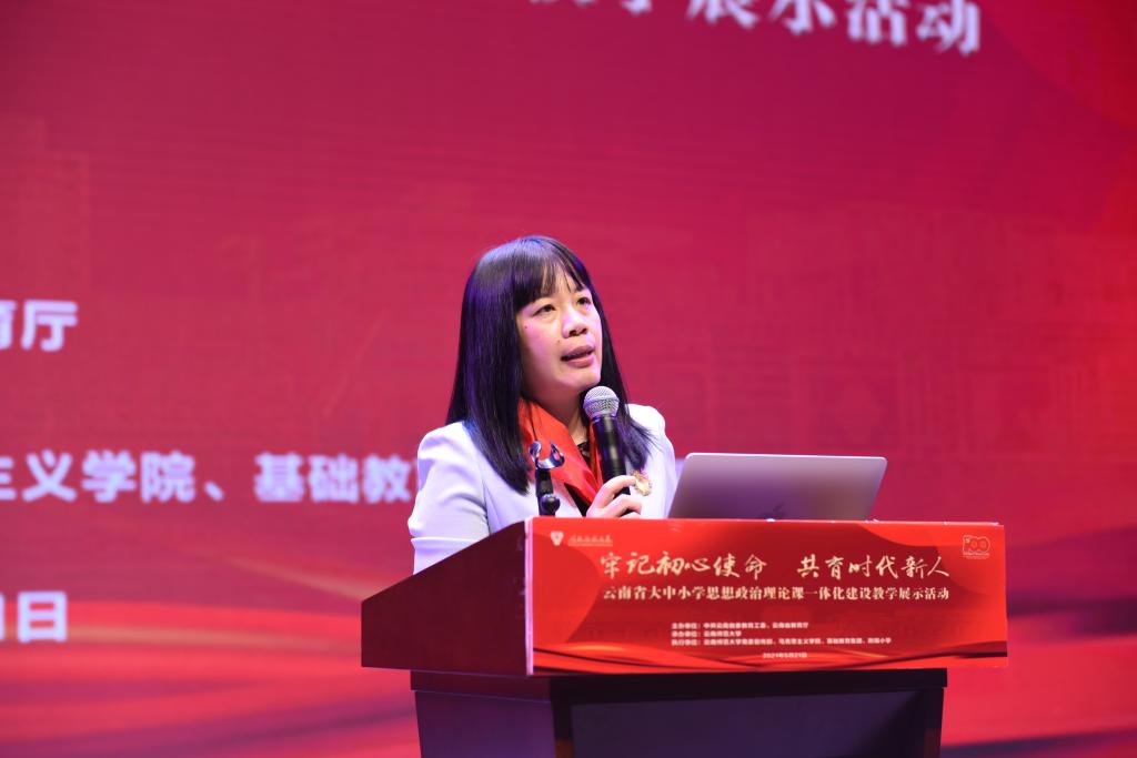 省委教育工委常务副书记杨林代表省委教育工委、省教育厅,对此次教学展示活动的顺利举办表示祝贺,对在思想政治理论课教学和研究中辛勤耕耘、默默奉献的老师们表示崇高的敬意。他指出,近年来,云南省出台深化思政课改革创新13条措施,大力配齐建强思政课教师队伍,积极拓展思政课建设格局,以实施思政课“手拉手”共建计划为重要载体,以集体备课、教学展示为重要途径,推动“大手”拉“小手”,积极探索大中小学思政课一体化建设有效路径。今后,云南省要按照大中小学纵向贯穿、循序渐进和各类课程横向结构合理、功能互补的原则,统筹推进大中小学思政课一体化建设,在“五个一体化”上着力,即教材一体化、教学一体化、教师专业发展一体化、管理一体化、科研一体化。杨林书记表示,思政课改革创新责任重大、意义重大,希望大家共同努力,成功打造云南省思政课改革创新的“升级版”。