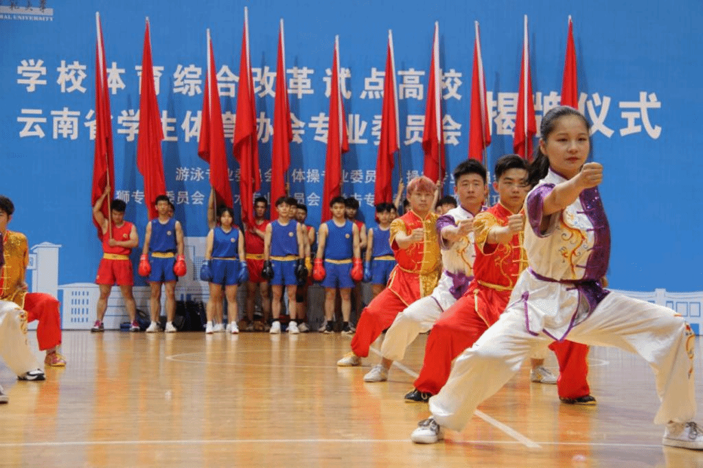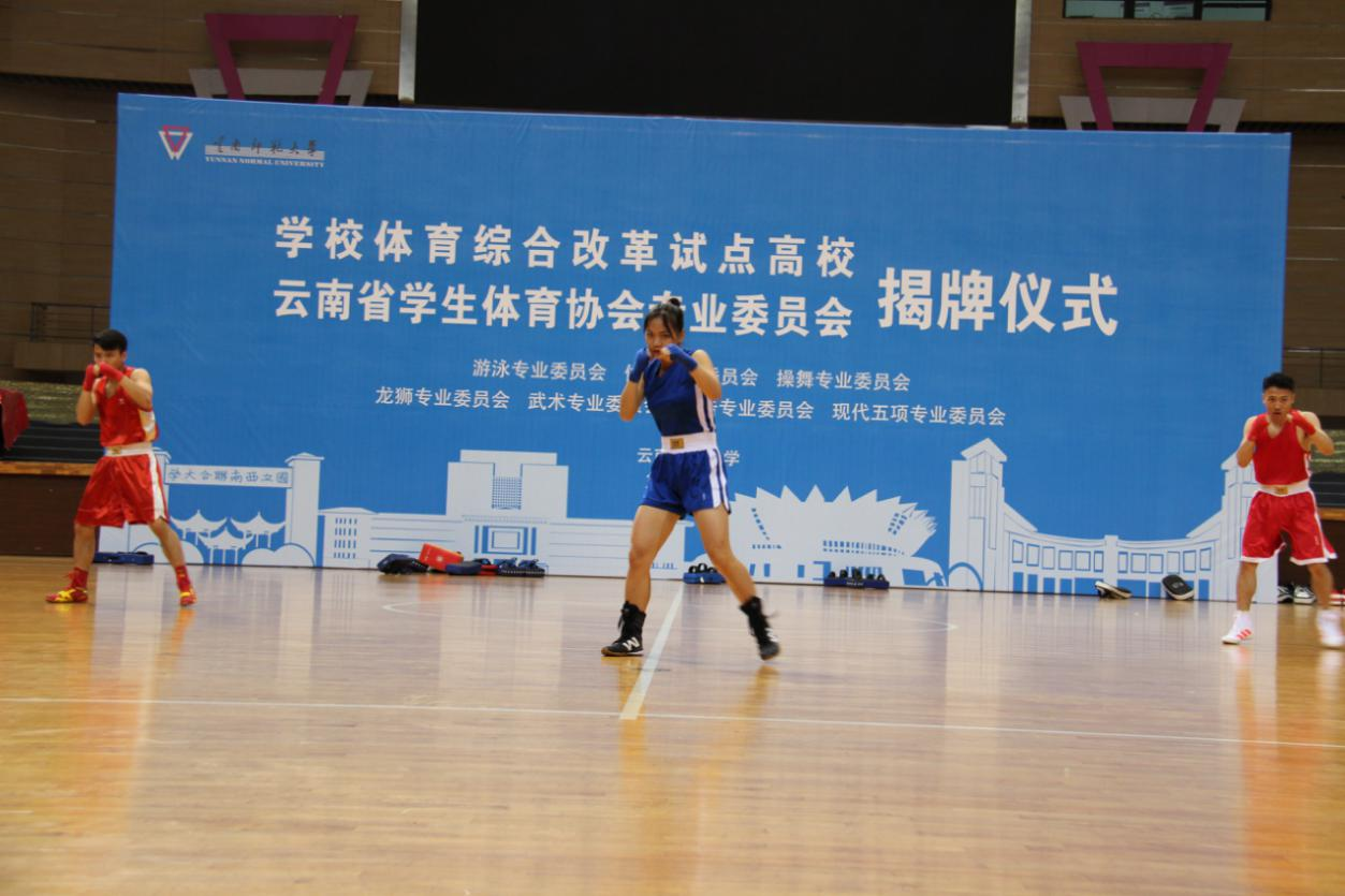 5月21日上午,云南省学校体育综合改革试点校暨云南省学生体育协会游泳、体操、操舞、龙狮、武术、拳击、现代五项专业委员会授牌仪式在我校呈贡校区西区启园体育馆如期举行。365英国上市官网牛治亮副校长,云南省教育厅体卫艺处徐忠祥处长,校工会常务副主席金黄斌,体育学院党委书记朱黎、院长聂真新,体卫艺处李华海,学生体协副秘书长车东兵,云南省武术协会主席胡宝林,各专业委员会主任和副主任参加了会议。授牌仪式由体育学院党委书记朱黎主持。