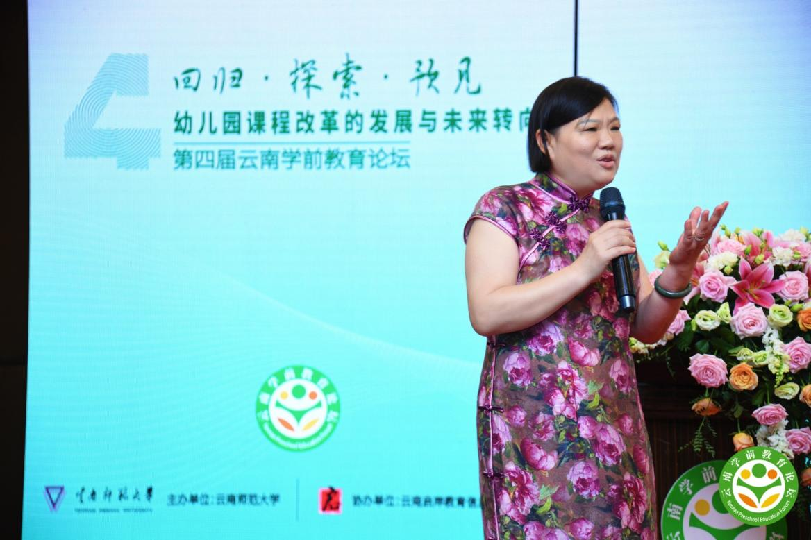 昆明市盘龙区新迎第一幼儿园总园长、党支部书记向燕以《立足当下 预见未来》从幼儿园的环境文化、管理文化、教学文化、课程文化四个方面,全面、细致地介绍了新迎一第一幼儿园的办园思路和文化探索。
