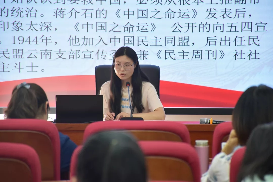 第一场党史学习读书分享会围绕新民主主义革命时期展开,由教工党支部、应用化学党支部的4位党员代表共同分享。重点分享了闻一多、江竹筠等前辈的革命事迹,并带领大家观看了节目《理想照耀中国》,现场气氛在朗诵经典诗词《七律·长征》中达到高潮。