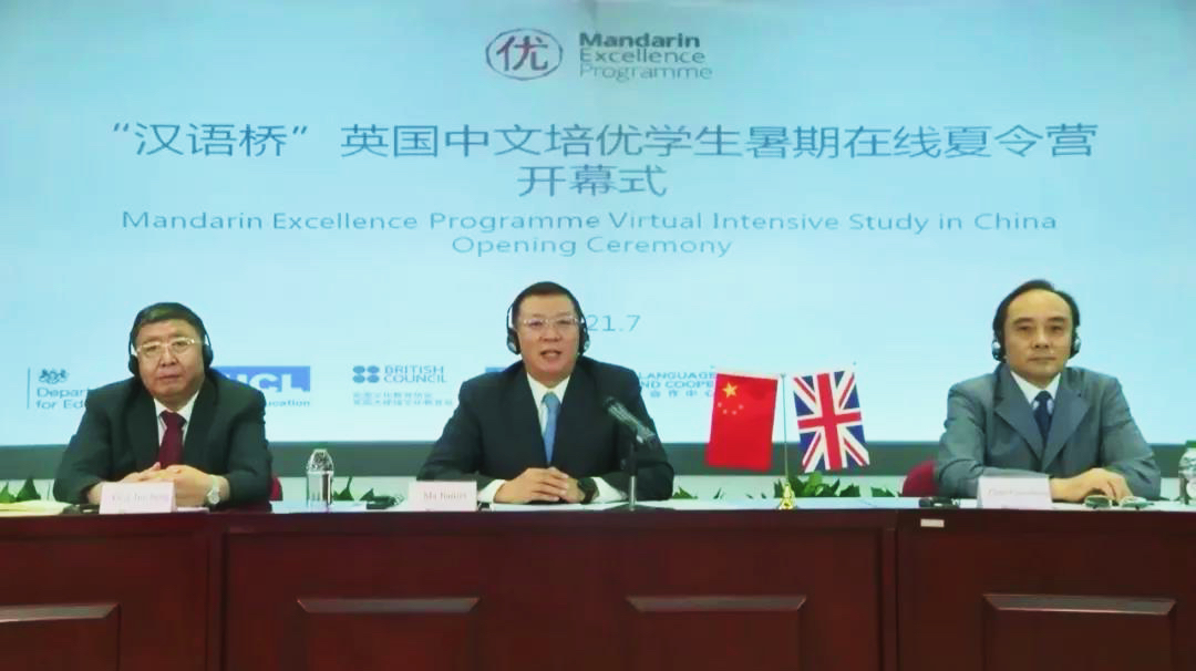 英国“中文培优”项目是由英国政府发起并出资支持,由英国文化教育协会、伦敦大学学院联合中国教育部中外语言交流合作中心主办,旨在培养优秀中文人才的项目。受疫情影响,今年夏令营通过线上平台举办。开幕式第一阶段由中外语言交流合作中心主任马箭飞主持,中国教育部副部长田学军、英国教育部学校事务部长尼克·吉布、英国大使馆文化教育公使/英国文化教育协会中国区主任包迈岫、伦敦大学学院教育学院院长李嵬出席并致辞,来自英国56所培优学校和中国14所访华研修承办院校近2000名师生参加了开幕式。