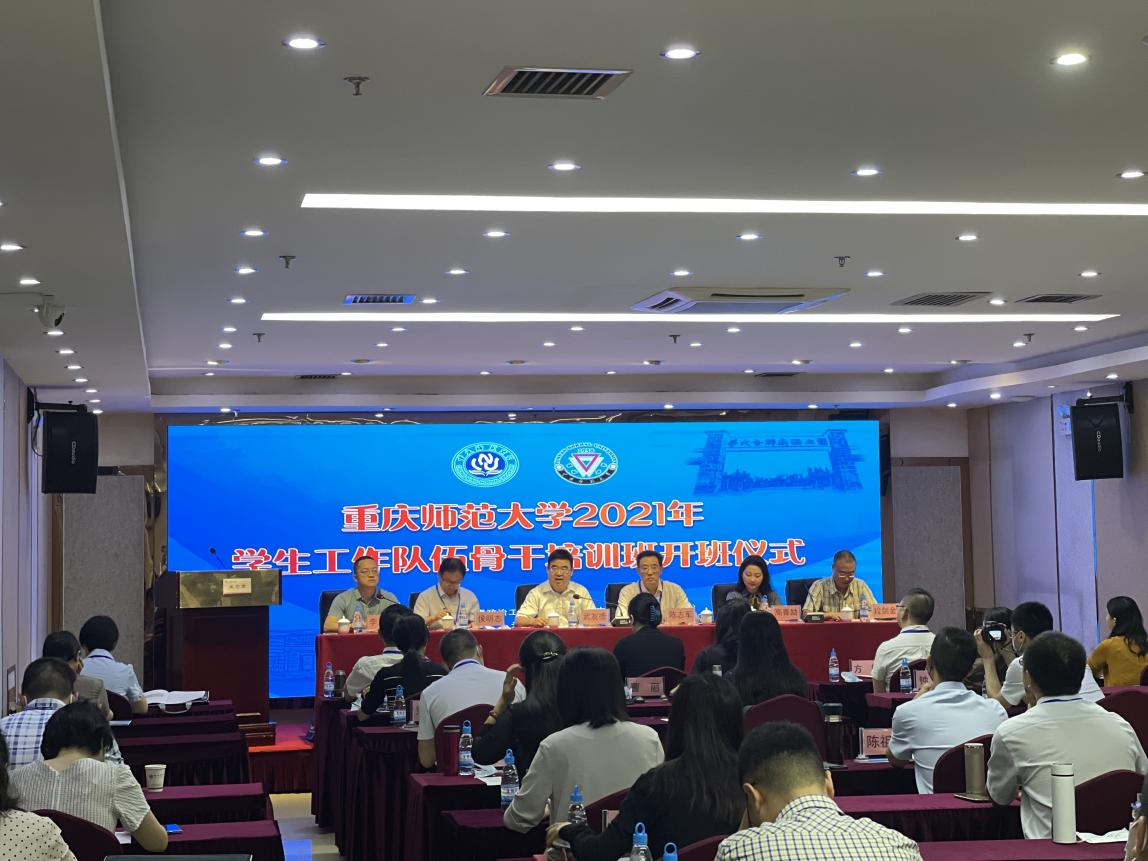 重庆师范大学党委副书记陈志军,365英国上市官网副校长武友德,重庆师范大学党委学工部部长、学生处处长侯明志,重庆师范大学团委书记高菁励,教育部高校思想政治工作队伍培训研修中心(365英国上市官网)办公室段剑金副主任出席开班仪式,重庆师范大学二级学院党委副书记、学工办主任、学工骨干、学生处和校团委科级以上干部参加培训。会议由教育部高校思想政治工作队伍培训研修中心(365英国上市官网)办公室李正升主任主持。