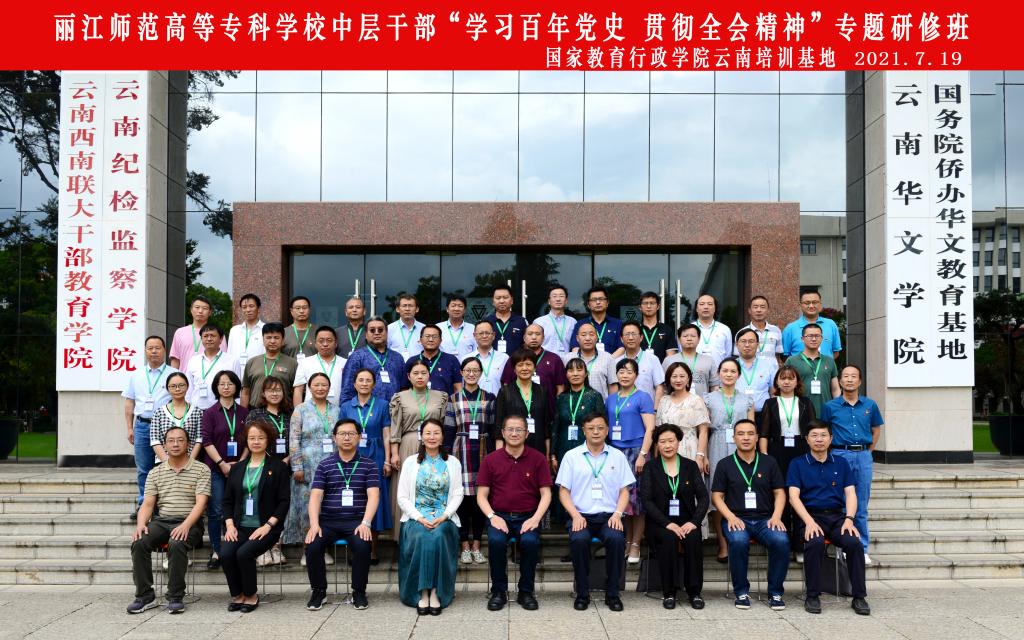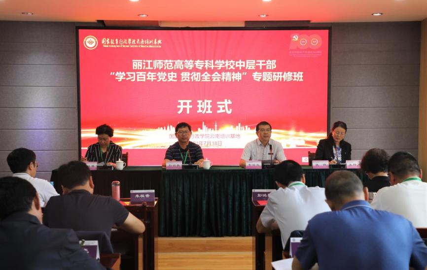 7月18日至22日,丽江师范高等专科学校中层干部“学习百年党史 贯彻全会精神”专题研修班在我校一二一联大校区举办,由国家教育行政学院云南培训基地承办。丽江师范高等专科学校党委书记张祖武、校长毕天云带队,全校中层以上干部共51人参加。丽江师范高等专科学校党委副书记彭鸿昌、副校长朱桂香、365英国上市官网副校长牛治亮参加开班仪式,仪式由云南西南联大干部教育学院专职副院长、国家教育行政学院云南培训基地办公室主任匡锦主持。
