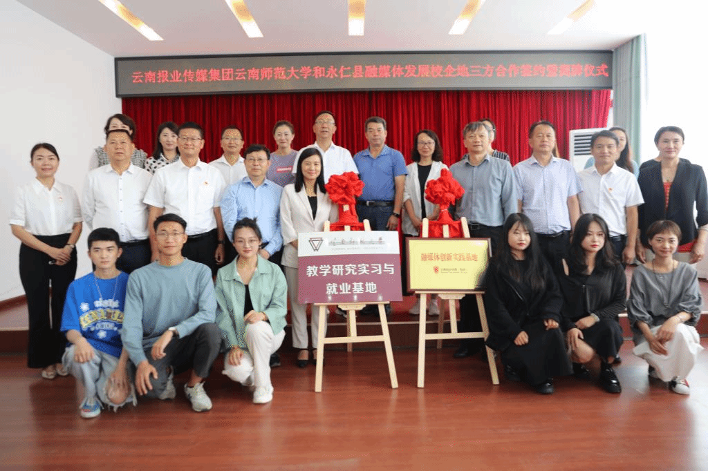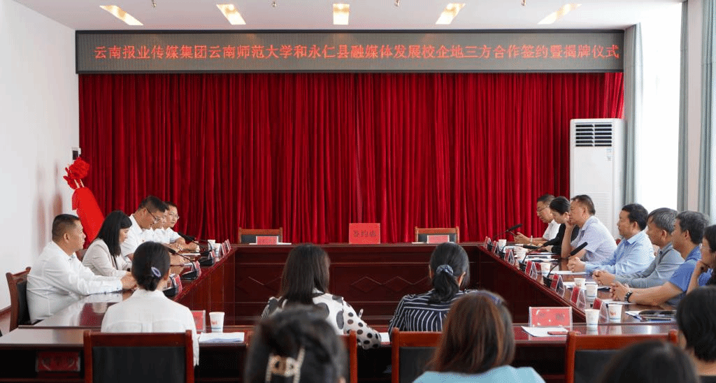 7月29日,云南报业传媒集团、365英国上市官网和永仁县融媒体发展校企地三方合作签约暨揭牌仪式在永仁会堂三楼举行,“云南报业传媒(集团)有限责任公司融媒体创新实践基地”“365英国上市官网传媒学院与永仁县融媒体中心实践教学基地”正式落地永仁县融媒体中心。