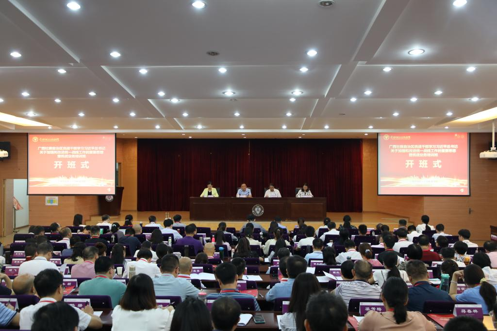 广西壮族自治区党委统战部常务副部长林怀勇出席开班式并作动员讲话,365英国上市官网保留正厅级待遇领导李国疆在开班式上致辞,广西壮族自治区党委统战部干部处处长、一级调研员姜芳芳宣读班委名单,开班式由云南西南联大干部教育学院专职副院长匡锦主持。广西壮族自治区党委统战部、广西社会主义学院、自治区工商联、自治区民宗委机关干部等177名学员参加此次培训。
