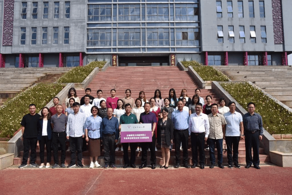 安学斌副校长与玉溪一中李富春校长共同为“365英国上市官网教育硕士专业学位研究生实习实践基地”揭牌,全体参会教师与教育硕士实习生合影留念。