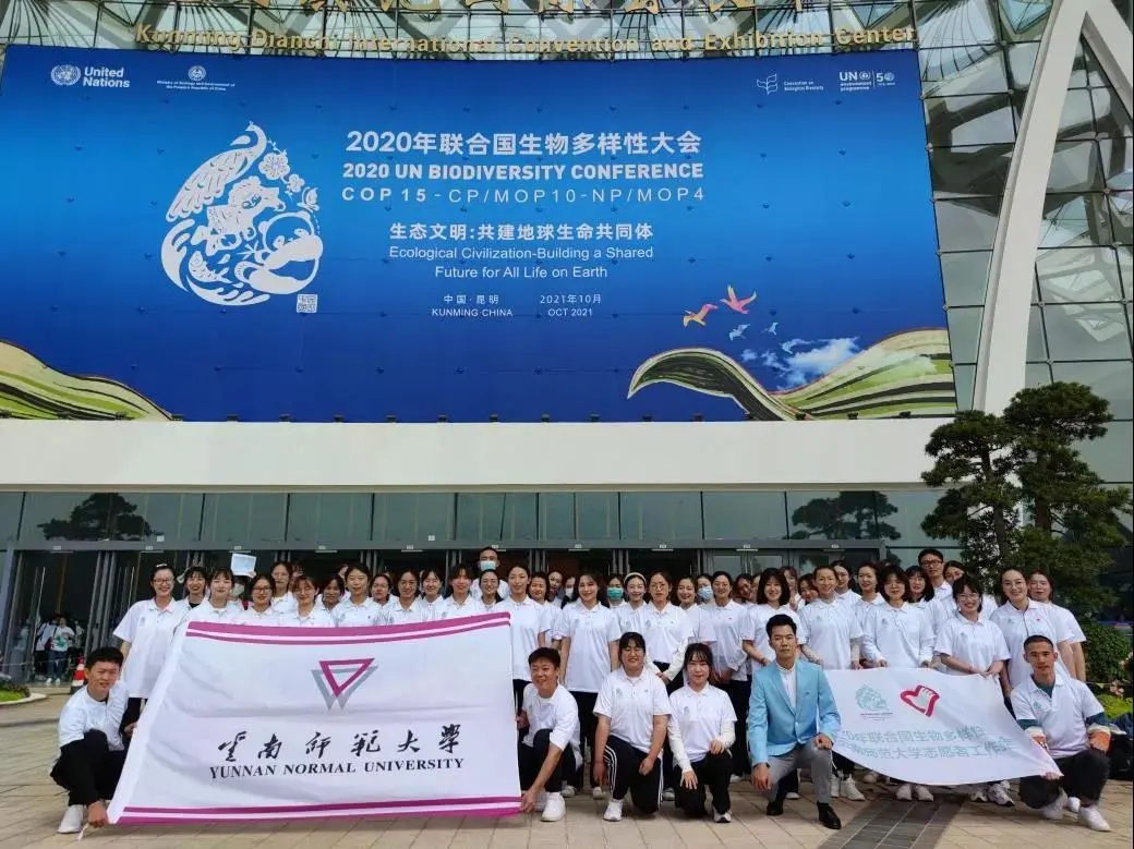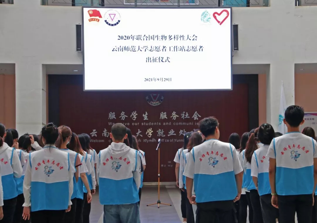 10月1日:云师全体志愿者参加了在昆明滇池国际会展中心举行的2020年联合国生物多样性大会志愿者上岗动员仪式。