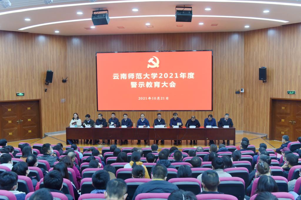 校党委书记蒋永文同志在讲话中指出,学校召开2021年度警示教育大会,主要目的是深入贯彻落实党中央、省委全面从严治党决策部署,通报我校重点纪律审查案例,以案示警、以案明纪、以案为鉴,以身边事教育身边人,切实做到防微杜渐、警钟长鸣,进一步加强学校党风廉政建设和反腐败工作。一是要以案为鉴,深刻汲取反面典型案例沉痛教训;二是要提高站位,切实增强“以案促改”的思想自觉和行动自觉;三是要坚定不移推动全面从严治党向纵深发展,加快“清廉师大”建设。蒋书记强调,在党中央、省委的坚强领导下,全面从严治党没有局外人,党风廉政建设和反腐败斗争永远在路上,要坚持“严”的主基调,坚持稳中求进的工作方针,切实加强各级领导班子和干部队伍建设,加强纪律建设,不断提高学校治理体系和治理能力现代化水平,打造清廉校园,构建风清气正的校园政治生态和教书育人环境,为云南加快社会主义现代化建设作出新的更大贡献。