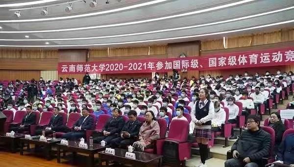 校长王德强致辞,代表学校向参加国际级、国家级体育运动竞赛取得优异成绩的各位运动健儿、教练员和体育工作者表示热烈的祝贺和崇高的敬意。王德强校长指出,党的十八大以来,学校认真贯彻落实习近平总书记关于教育、体育的重要论述和全国教育大会精神,牢记初心使命,不断加强体育教育,努力培养德智体美劳全面发展的社会主义建设者和接班人,为加快建设体育强国贡献力量。一是竞技体育实现重大突破。截至目前,我校运动健儿在奥运会、残奥会等国际级体育竞赛中荣获奖项38项、国家级比赛中荣获奖项293项、省级比赛中荣获奖项706项,我校代表团连续六届蝉联云南省大学生运动会金牌总数和团体总分第一名。二是体育教育事业蓬勃发展。学校紧紧围绕教师教育特色培养体育人才,荣获国家、省级教学成果奖,通过国家、省级一流课程认定,成为西南地区培养基础体育教师、高层次体育科研人才、运动训练人才、体育管理人才和国家级社会体育指导员的重要基地,培养了各类体育专门人才2万余名,赢得了社会广泛赞誉。三是全民健身水平不断提升。学校牢固树立“健康第一”的教育理念,扎实推进全民健身活动,加强校园体育文化建设,办好年度体育节、校级田径运动会,开展千人太极拳、千人啦啦操等活动,全民健身的氛围日益浓厚,“我运动、我健康、我快乐”的运动健康理念在校园蔚然成风。王校长衷心希望云南师大体育在新时代迸发出更加强劲的活力,祝愿中国体育谱写出更加光辉灿烂的篇章。