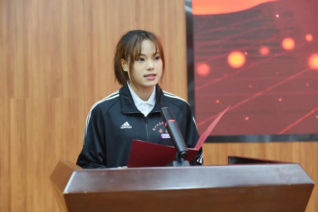 第20届中国大学生田径锦标赛女子丙组跳远比赛冠军,2018级运动训练本科生江南同学发言,分享了自己站在全国高校最高水平田径竞赛的最高领奖台上的感受。她深有感触地认为,云南师大体育有着光荣的历史和传统,众多运动项目的运动员、教练员都在全年无休的拼搏着。她说:“荣誉的背后是日积月累的坚持,所有的寒暑假、节假日我从未停止过训练。不畏困难,坚毅前行,朝着自己的目标一步一步迈进是我们云师体育人共同的人生信条。”江南相信,云南师大竞技体育在未来一定会有更大的发展。
