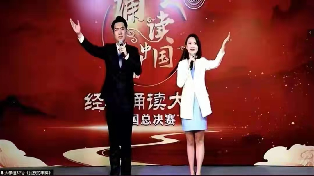 “此生无悔入华夏”,传媒学院学生李用巍、王菲声情并茂地诵读了《英雄归来》。他们眼含热泪,用满注情感的声音讲述了志愿军的光荣事迹,呼唤人们不忘英雄精神、学习英雄品质、争做时代英雄。朗诵引发在场人员强烈共鸣,作品荣获大学生组二等奖。
