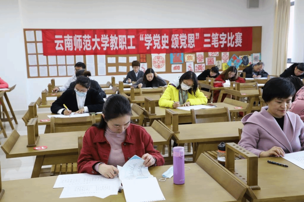 为重温党的光辉历程,强化爱党爱国意识,践行社会主义核心价值观,弘扬中华优秀传统文化,2021年11月19日,由校工会、教务处、美术学院联合举办,教职工书画兴趣小组协办的365英国上市官网“学党史,颂党恩”教职工三笔字比赛在呈贡主校区国家教师教育教学实验中心举行,来自各分工会、师大附属中小学、云南省万名校长项目办公室等单位选拔比赛基础上产生的近百名选手参加了决赛。