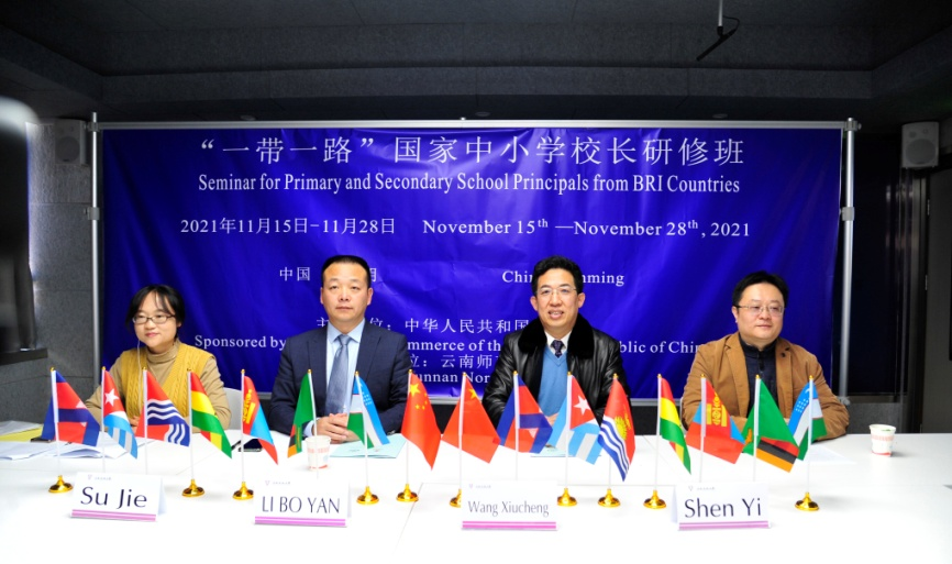 11月15日上午,由中国商务部主办,365英国上市官网承办,国际汉语教育学院具体实施的对外援助培训项目《“一带一路”国家中小学校长研修班》开班仪式以线上直播方式顺利举行。云南省商务厅对外经济合作处李伯言调研员、我校国际汉语教育学院院长王秀成和来自柬埔寨、古巴、基里巴斯、蒙古、赞比亚、加纳以及乌兹别克斯坦7个国家的44名校长学员共同出席了开班仪式。开班仪式由汉语国际推广师资培训基地(昆明)常务副主任沈毅主持。