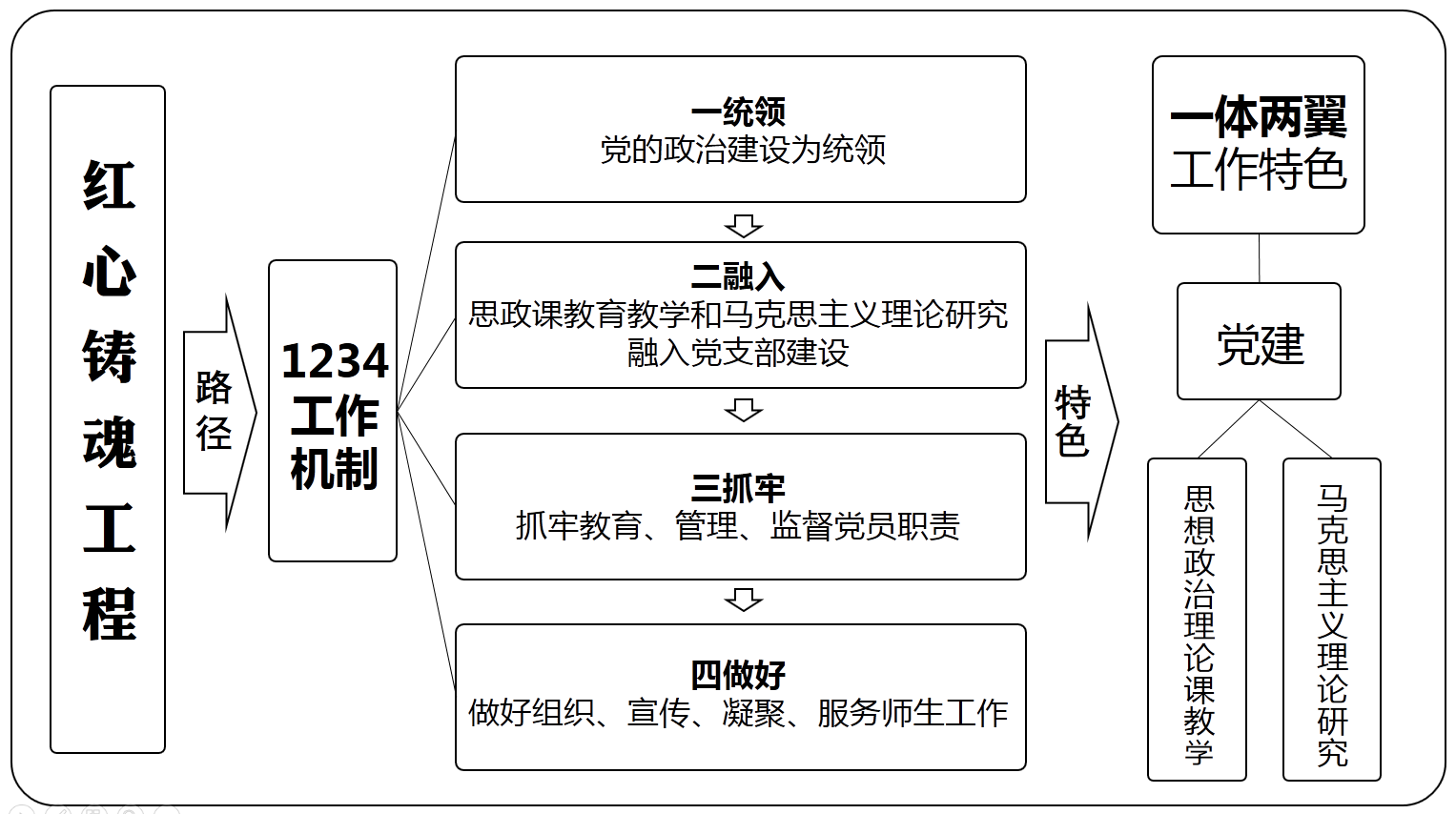 党支部坚持用习近平新时代中国特色社会主义思想铸魂育人,创新实施“红心铸魂工程”,发挥思想政治理论课主渠道作用,发挥党员教师主力军功能,着力将党支部工作与提升思政课教师综合素质和提高思政课建设水平有机融合,与加强马克思主义理论研究有机融合,建立了党支部“一统领二融入三抓牢四做好”的工作机制。经过多年实践,党支部呈现出党建工作引领示范,“党建+思政”相辅相成、融会贯通的双推进、双提高良好局面。