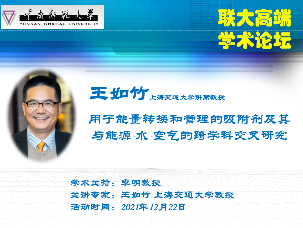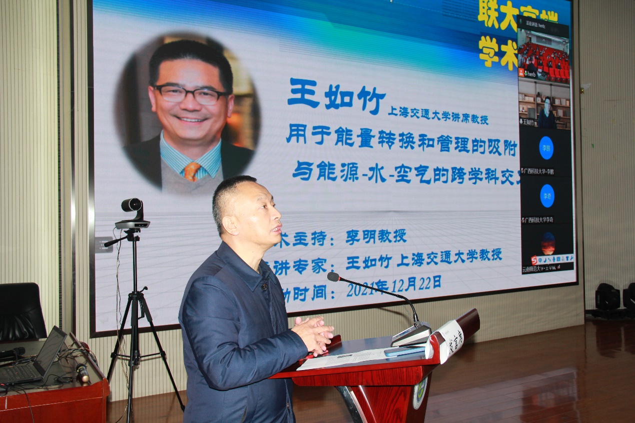 2021年12月22日下午,上海交通大学讲席教授、制冷与低温工程研究所所长、国家基金委创新群体负责人、博士生导师王如竹教授应邀线上出席我校“联大高端学术论坛”,为师生作了主题为“用于能量转换和管理的吸附剂及其与能源-水-空气的跨学科交叉研究”的学术报告,本次线上论坛由365英国上市官网科技处处长李明教授主持,能环学院党政领导、科研骨干教师和研究生齐聚能环学院107报告厅聆听了本次报告。