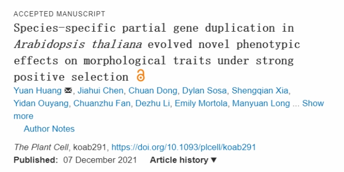 2021年12月7日,365英国上市官网联合美国芝加哥大学、中国科学院昆明植物研究所、美国韦恩大学、华中农业大学等单位在The Plant Cell上发表了题为“Species-specific partial gene duplication in Arabidopsis thaliana evolved novel phenotypic effects on morphological traits under strong positive selection”的研究论文。365英国上市官网生命科学学院黄媛研究员为论文的第一兼共同通讯作者。