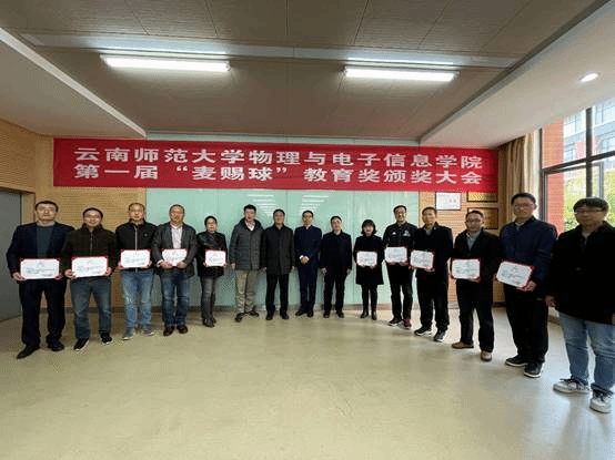 2月25日下午,第一届“麦赐球”教育奖颁奖仪式在物理与电子信息学院213会议室举行,我校校长王德强、云南南方教育集团董事长兰靖、我校物理与电子信息学院全体教师参加了颁奖仪式。