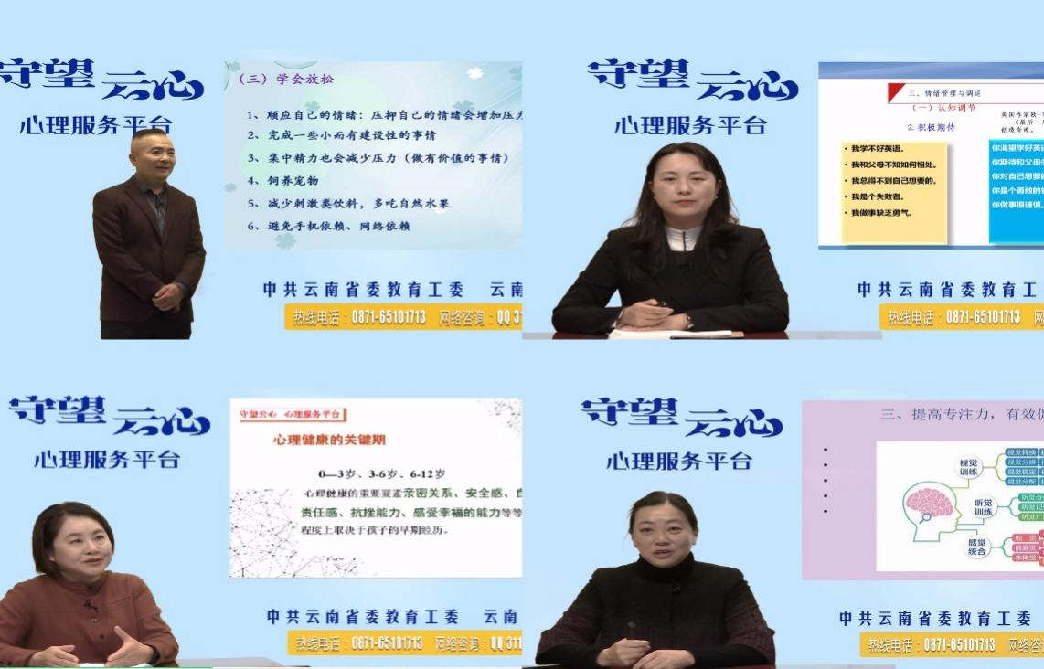 心理健康教育咨询中心承担云南省委教育工委、省教育厅“守望云心”心理服务平台的培训、咨询、服务工作,共组织全省心理学专家开展了6期线上讲座,受众超30万人次。全面开展心理健康宣传教育,通过线上线下各类活动,普及心理健康知识和自我调适技能,消除师生由于疫情引发的心理困扰,辐射学校师生3万余人次。落实心理健康专职教师咨询值班制度,确保及时应对因疫情诱发的突发心理危机和情绪问题等案例。对现有心理危机学生和心理晴雨表中重点关注学生进行研判和分级,开展积极心理援助和人文关怀,已处理危机个案16例,累计接待线上线下心理咨询339人次,其中与疫情相关的100余人次。