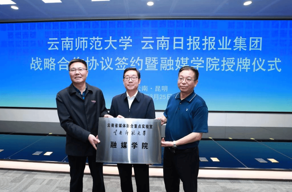 3月25日,我校与云南日报报业集团战略合作协议签约暨融媒学院授牌仪式在云报集团全媒体中心举行。校长王德强,对外合作交流处、传媒学院相关负责人出席了活动。