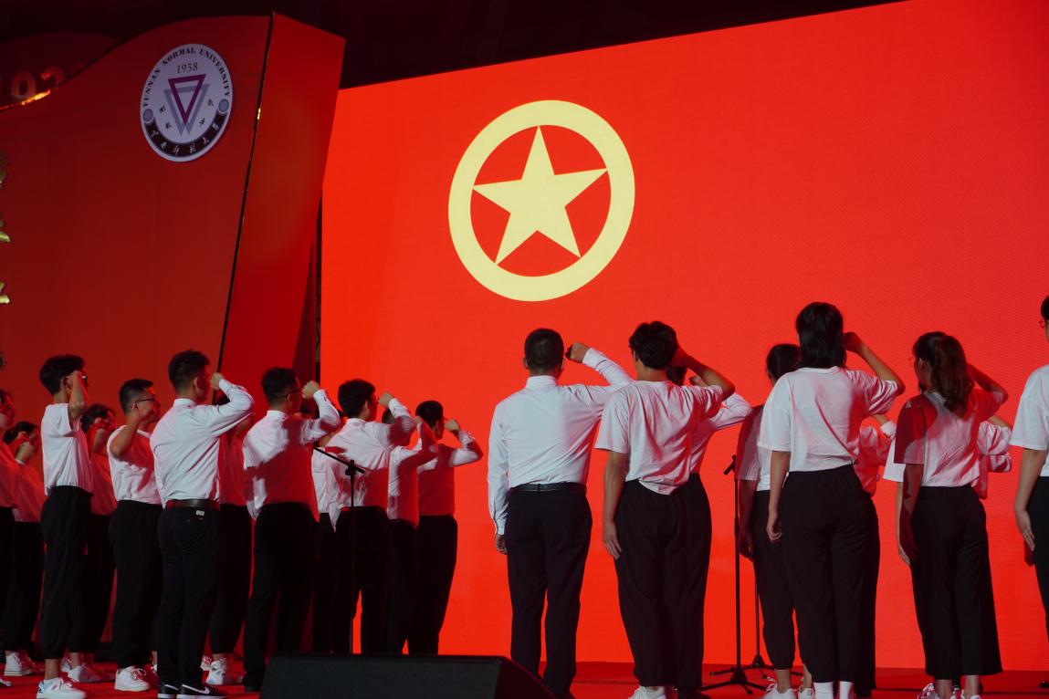 第三篇章《不负韶华》的视频片《汇聚奋进力量》,展现了云师青年学子的逐梦历程,大家秉承刚毅坚卓的精神,自觉把理想追求融入党和国家的事业中。校团委原创歌曲《如你所愿》首次现场呈现,展示出云师青年用实际行动践行青春誓言的决心和信心,以此向建团百年致礼。在新团员入团仪式环节,二级学院(学部)团委书记代表为新团员代表配戴团徽,校团委书记郑伟俊老师领誓,铿锵的入团誓词催人奋进。