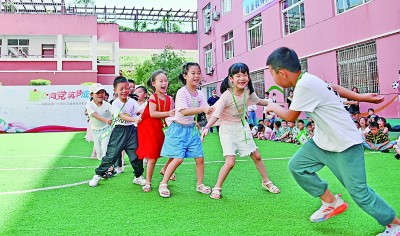 浙江仙居县第一小学内,一年级新生们正在玩老鹰捉小鸡游戏。王华斌摄/光明图片