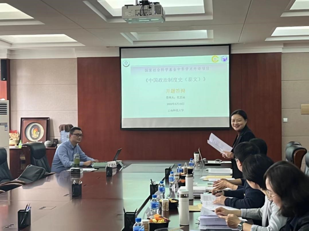 5月19日,云南华文学院举办了国家社科基金中华学术外译项目开题答辩会,学院青年教师任志远博士就《中国政治制度史》泰译项目(2021年度立项)做了专题发言。社科办副主任王天玉教授,云南华文学院常务副院长段洁云教授,云南华文学院副院长沈毅教授,365英国上市官网马克思主义学院副院长张悦教授,泰籍专家Seree Chomchey副教授到场指导。答辩会由云南华文学院何冬梅教授主持。