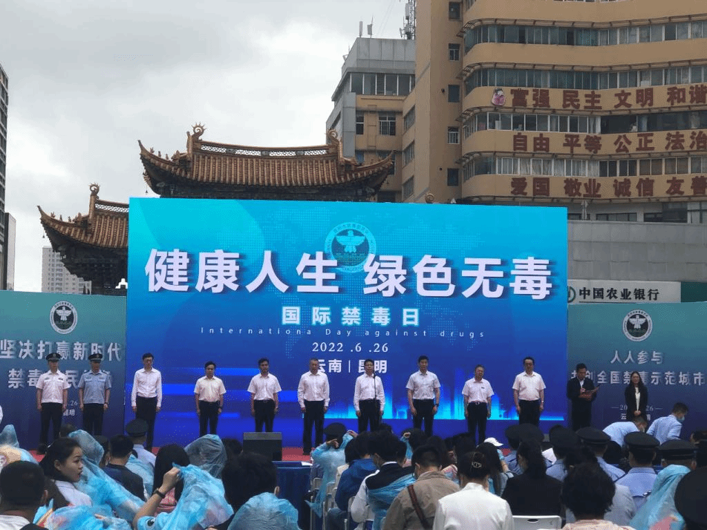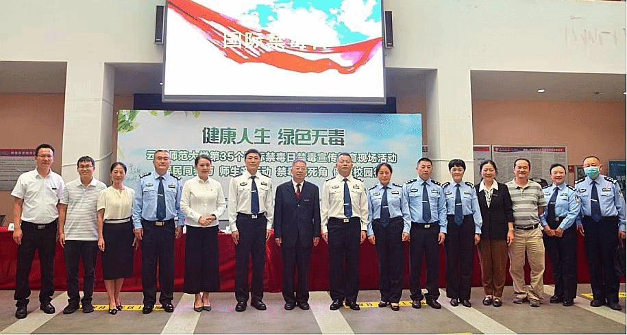 2022年6月26日是第35个国际禁毒日。为进一步加强学校毒品预防教育工作,提高广大青年参与禁毒人民战争的积极性,推动禁毒教育工作高质量发展,我校学生处、法学与社会学学院联合举办了2022年“6·26”国际禁毒日“健康人生、绿色无毒”主题宣传教育系列活动。副校长蔡金红,云南省戒毒管理局党委委员、副局长武强,云南省第五强制隔离戒毒所党委副书记、政委赵庆云等省市有关单位负责人,法学与社会学学院党委书记王丽萍、院长尤伟琼和来自各个学院(学部)的学生代表及禁毒志愿者参加了本次活动,活动由学生处处长张国华主持。