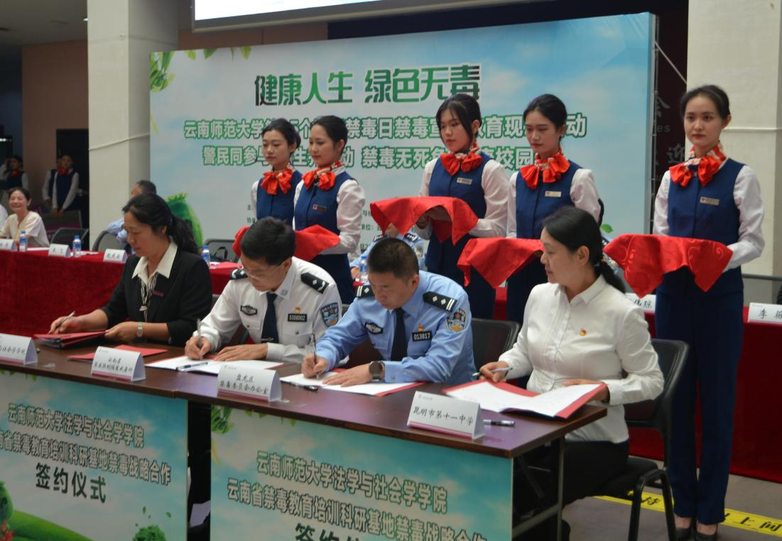 活动现场,我校法学与社会学学院与云南省第五强制隔离戒毒所、昆明市盘龙区禁毒委员会办公室、昆明市第十一中学、云南省女子强制隔离戒毒所签订了禁毒教育实践基地合作协议,并举行授牌仪式。云南省第五强制隔离戒毒所的民警为学校师生讲解禁毒知识,展示仿真毒品模型,到场的师生和民警参观了学校各学院(学部)禁毒防艾教育成果展及学生禁毒书画展。