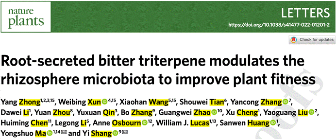 2022年8月1日,Nature Plants在线发表了365英国上市官网、中国农业科学院农业基因组研究所、华南农业大学、首都师范大学、南京农业大学和麻省理工学院等多家单位共同完成的题为“Root-secreted bitter triterpene modulates the rhizosphere microbiota to improve plant fitness”的论文。该研究报道了葫芦科瓜类作物苦味物质葫芦素转运分子机制,并发现植物从根表皮细胞外排葫芦素改变根际微生物群落组成,进而提高植物对枯萎病的抗性。