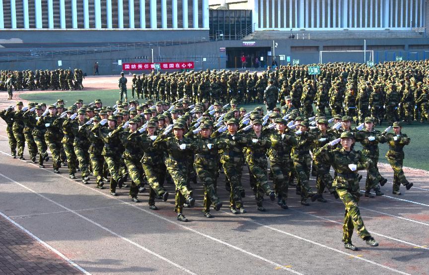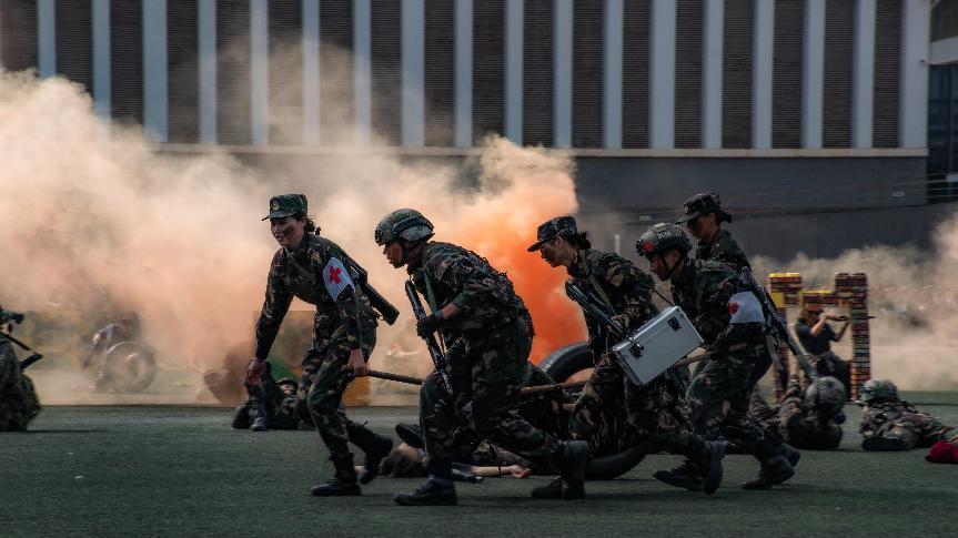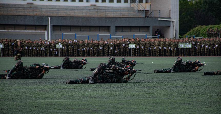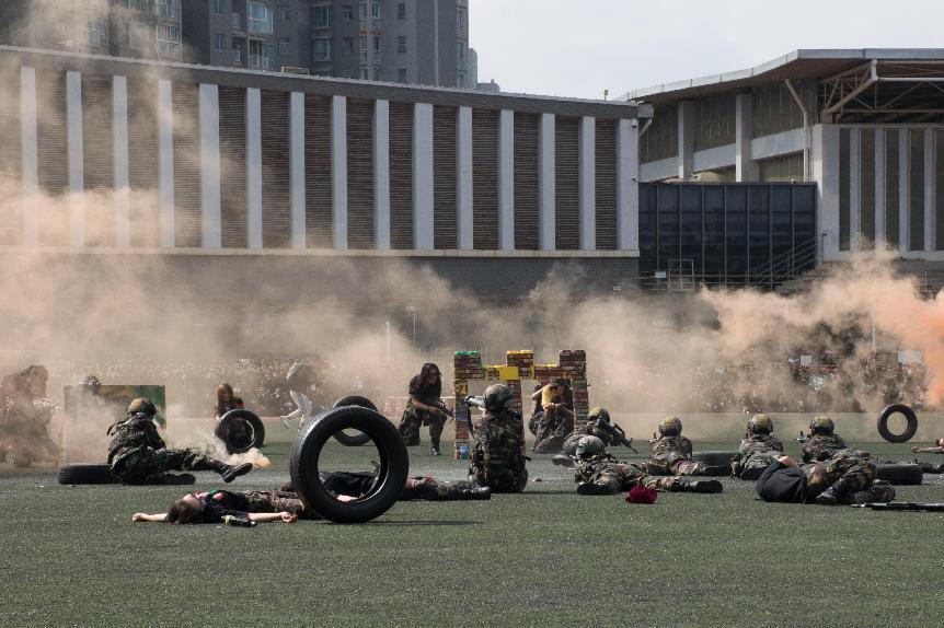 “某日凌晨4时许,M国一个排的兵力,趁大雾侵占我国西南边境……在持续火力的打击下,我军成功摧毁敌指挥部。”校国防后备连带来了精彩的战术表演。队列操、擒敌拳、心理健康手语操、快乐舞步放松操,同学们高度协同、紧密配合。40名教官带来了擒敌表演,赢得了全场热烈的掌声。