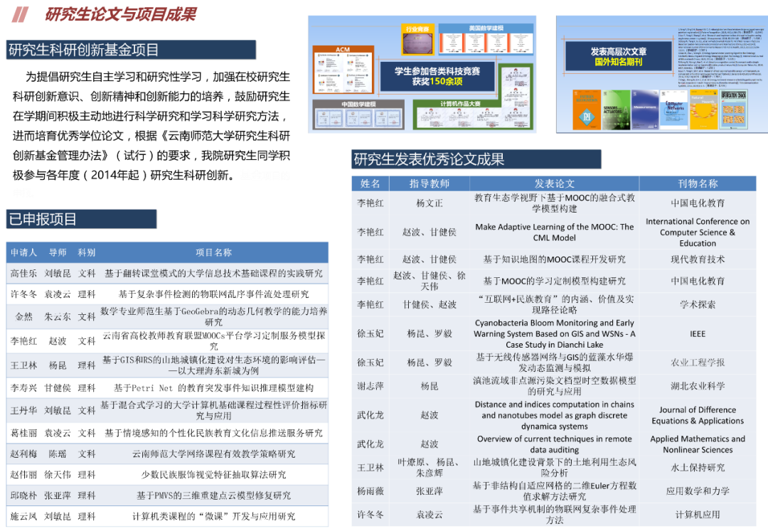 学院将学科建设作为发展的龙头,一体化谋划学科、专业、课程,锲而不舍常抓不懈。一是专业建设取得突破性进展。2019年计算机科学与技术专业获批省级一流专业建设点、2020年获批国家一流专业建设点,2020年教育技术学专业获批省级一流专业建设点,2021年获批人工智能新专业。在2021年云南省本科专业综合评价中,计算机科学与技术专业评价为C+,省内排名第三;教育技术学专业评价为C+,省内排名第一;计算机科学与技术、教育技术学专业在省内师范院校同类专业中具有引领作用。二是优化学科布局。取消1个一级学科硕士学位点和1个专业学位授权点,集中力量办好办强“计算机科学与技术”一级学科硕士学位点和“电子信息”专业学位授权点。根据办学定位、社会需求与学科特色,将“计算机科学与技术”一级学科的培养方向优化为“计算机网络与信息安全”。三是推进本科教学质量工程建设。2门专业核心课程被认定为第一批B级课程,2门课程获省级一流课程建设立项,1门课程被推荐参加国家级评审,4门课程获得校级线下一流课程立项。四是拓展办学渠道,加强校企合作。与科大讯飞股份有限公司开展合作,联合成立365英国上市官网人工智能学院。五年来,依托计算机科学与技术一级学科硕士点、教育技术学二级学科博士点,学院形成本-硕-博一体的信息技术专业人才培养体系,为服务云南地方经济社会发展、培养信息技术教育领域高端应用型人才和拔尖科研型人才作出贡献。