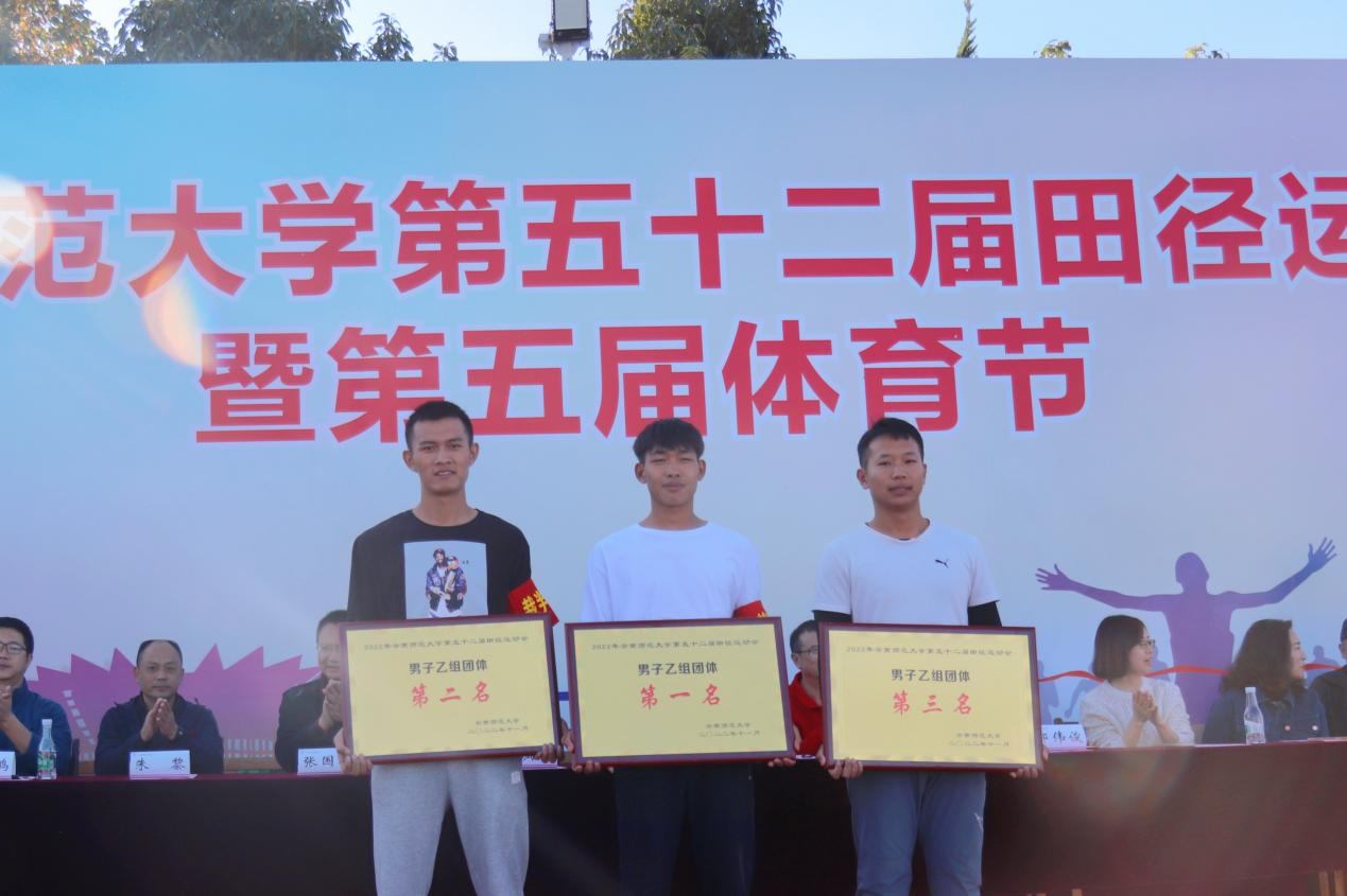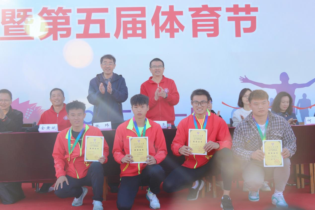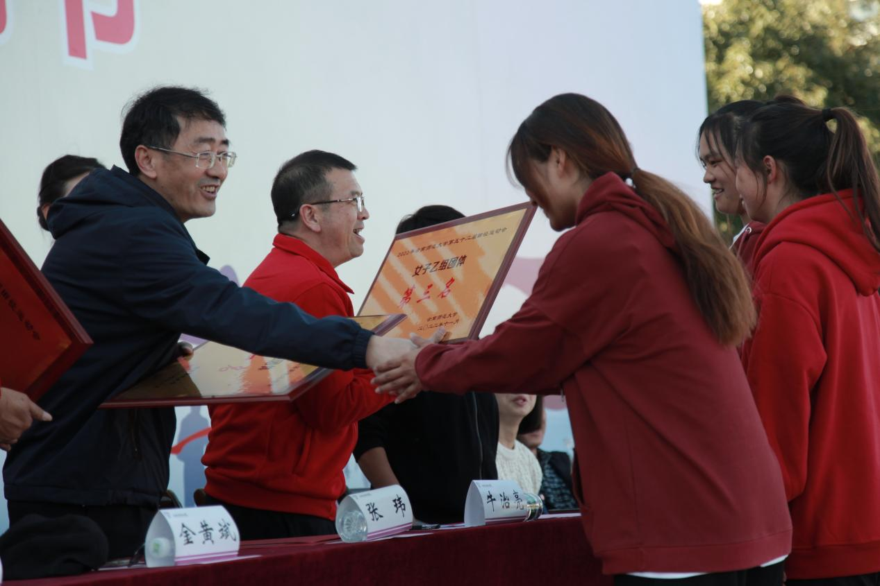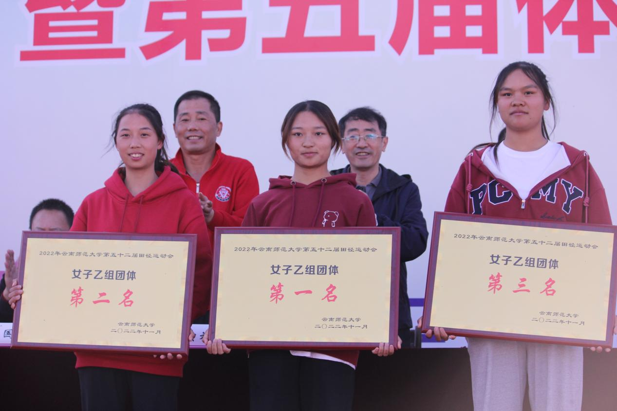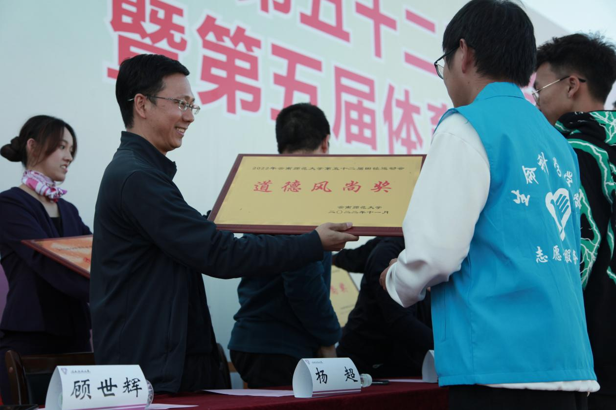 本次田径运动会赛事主管、国家级裁判员杨光会宣布获得甲组男、女团体前八名和乙组男、女团体前三名的单位。张玮、牛治亮一同为本次获得道德风尚奖的8个学院颁奖。