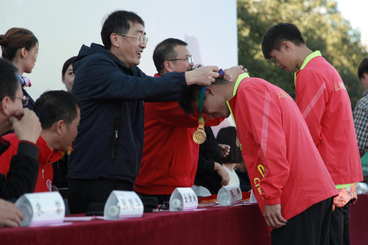 体育学院党委书记华致雄宣读了运动会破记录情况:数学学院杨启明同学在男子甲组200米比赛中以22秒34的成绩打破校级记录;体育学院2022级运动训练胡桂东同学、2020级体育教育张梦天同学、2022级运动训练赵云红同学分别在男子乙组200米比赛、110米跨栏比赛、铅球比赛中以21秒37、14秒55、15米29的成绩打破校级记录。与会领导为破校级记录同学,甲组男、女团体前八名和乙组男、女团体前三名单位颁奖。